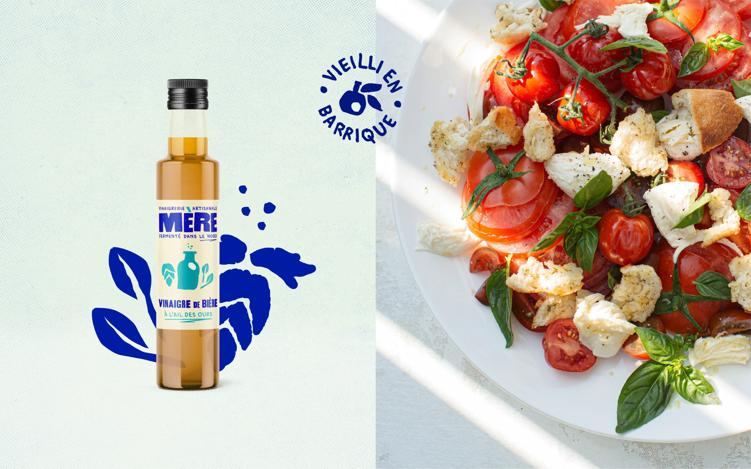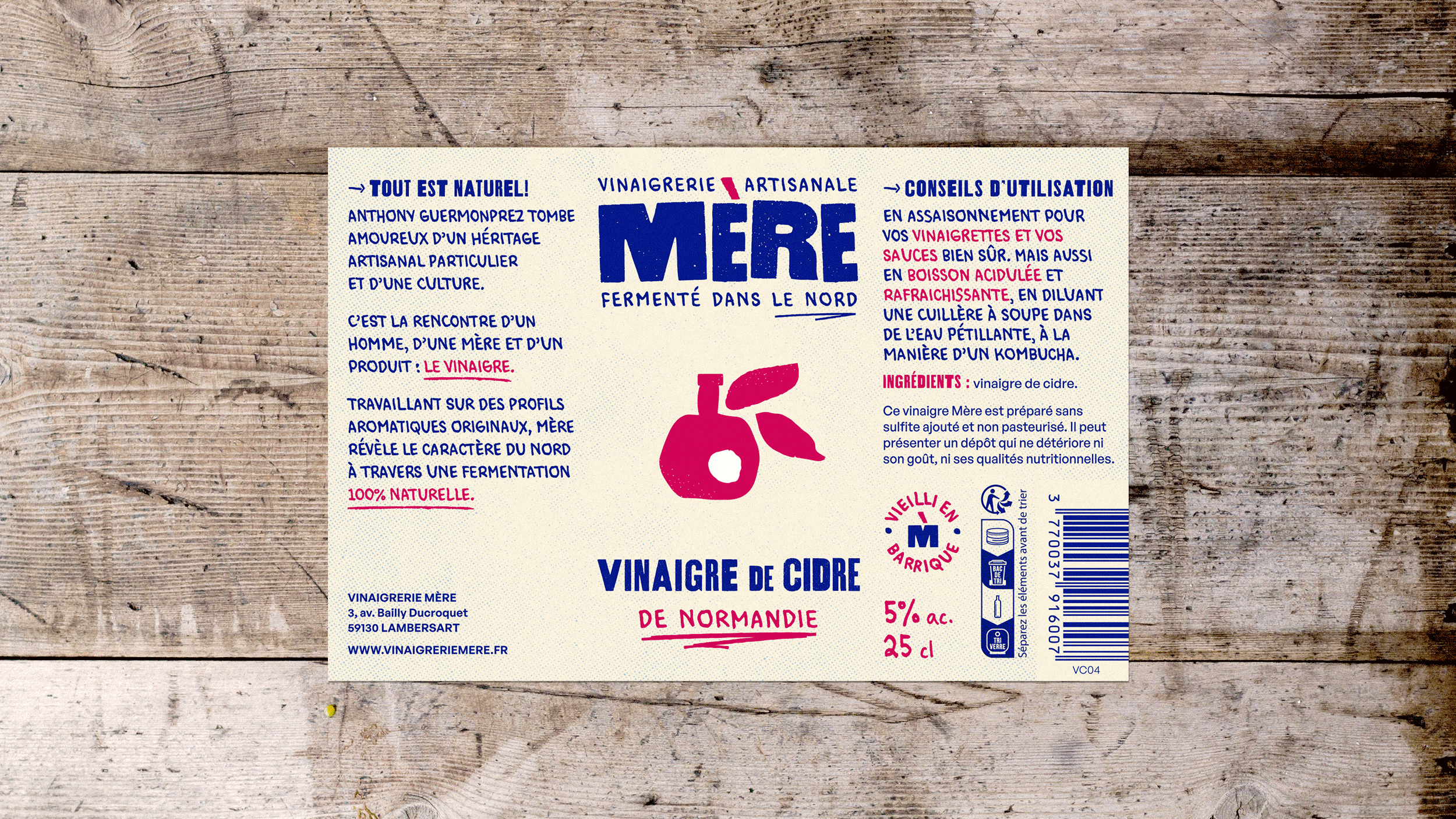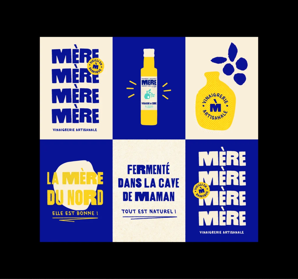 Mère est une vinaigrerie lilloise qui met en avant son terroir et la culture du Nord. Papier Machin reprend l’esthétique du fanzine pour exprimer la production alternative de ces vinaigres pas comme les autres. La marque répond aux générations à la recherche de goût, d’acidité et de proximité.