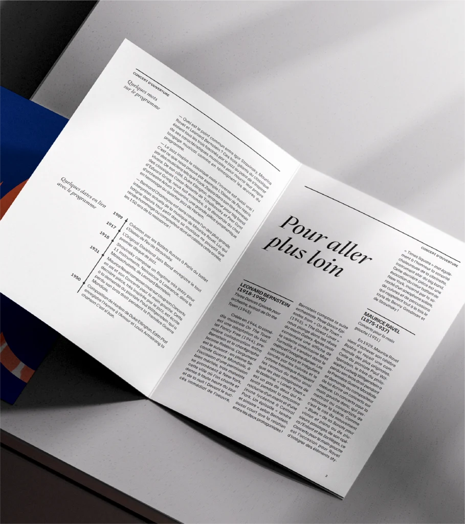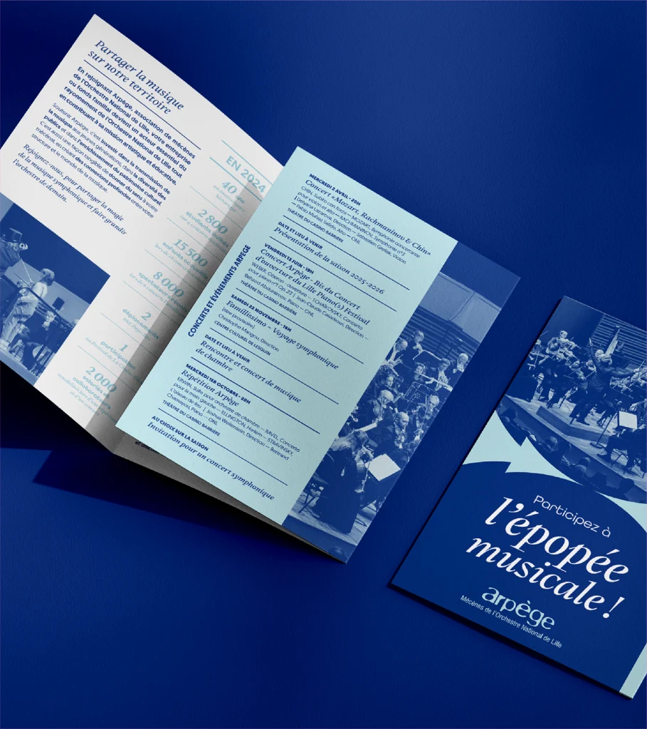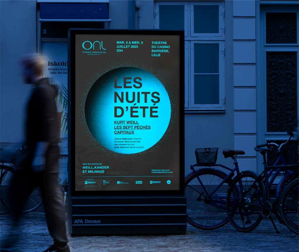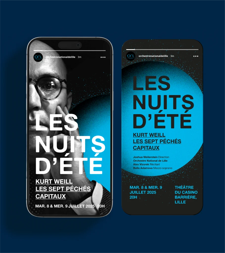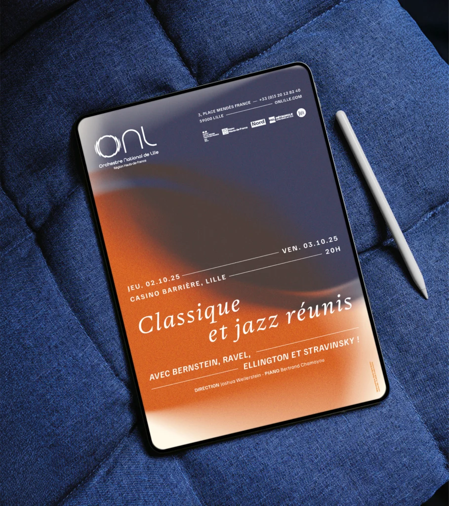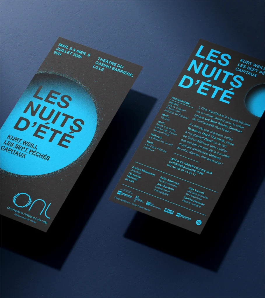 Pour accompagner l’Orchestre National de Lille, Papier Machin a été chargé d’imaginer le territoire graphique de la saison 2025-2026. Un voyage musical hors-les-murs, une rencontre entre la musique et le raffinement graphique. Univers visuel complet et déclinaison de tous les supports de communication (print, digital, motion).